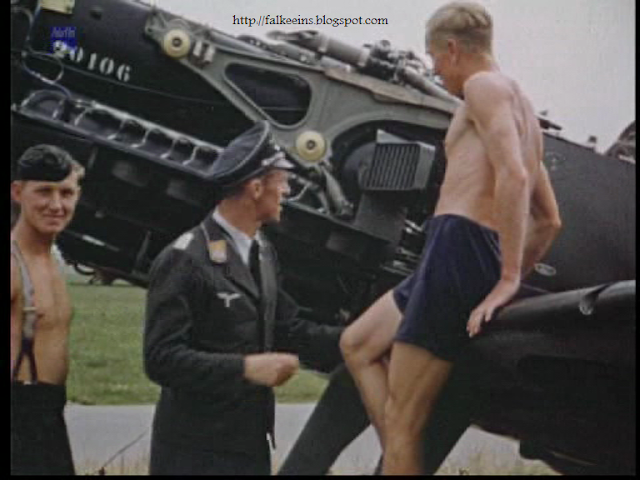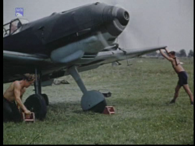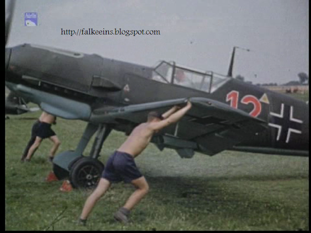 Film screen shots from a German documentary featuring Hannes Trautloft in this PK film. This footage tends to reinforce the notion that 109 Ds and Es were not painted in a single uppersurface green as sometimes stated and which appears to be IMHO merely an effect of lighting conditions - double click on the image for a larger view...