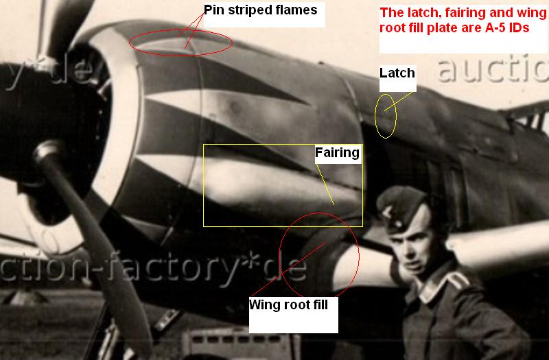 At some point one of these aircraft was fitted with the 'high altitude ram intakes' and it is difficult to say which one exactly. The 'tulip decoration' seems to have had white outlines on red flames. The main wheels were of the 'eight-hole' type as was common with earlier Fw 190 As. All the images here appear to show the A-5 WNr. 2594. Click on the images for a closer view. References inlcude Ebay auctions, Le Focke Wulf 190 by Lorant and Frappé (Docavia) and the November 2000 issue of Le Fana de l'Aviation.