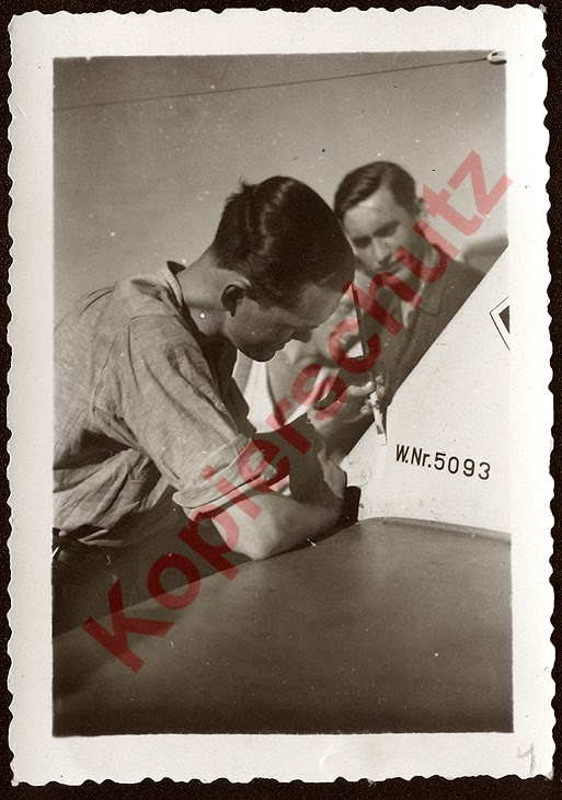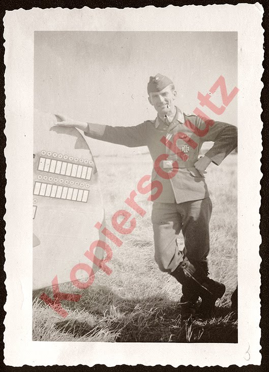 Above - Werner Machold's second Abschuss being painted on the tail of his Emil during the French campaign. This 1.Staffel ace was one of the most successful JG2 pilots of the campaign in the West and is seen here (below) posing alongside his impressive rudder scoreboard. He achieved his twentieth victory during the latter stages of the Battle of Britain.