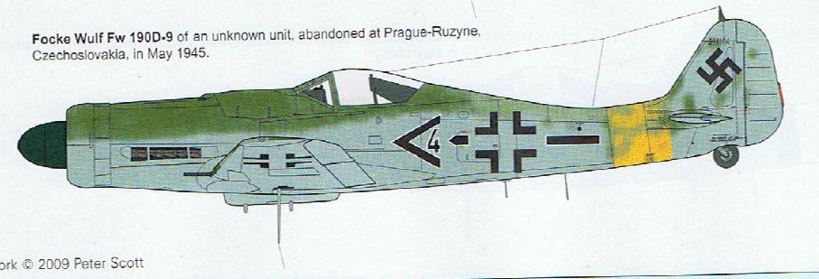 On May 5, 1945, Czech Radio called on the citizens of Prague to rise up against the Nazi occupying force and for five days Czechs took up arms against German troops until the Red Army arrived in the capital on May 9. Elements of JG 300 - attempting to fall back to Prague from southern Germany - were caught up in the fighting during the uprising. This particular Dora was on strength with Stab./JG 300 and photographed in Prague in June 1945. Kommodore Günther Rall's Geschwaderstab had re-equipped with the Dora in late April 1945. It is unlikely that the former JG 52 ace ever flew a combat sortie in a D-9 during his brief tenure of JG 300. Given the shortages of fuel in the last weeks of the war, sorties flown by JG 300 Doras comprised a handful of training circuits and strafing missions against US spearheads pressing into southern Germany. 'Black <4' displays a representative 211xxx series camouflage finish with a solid RLM 83 dark green engine cowling and an over-painted area of RLM 75 on the rear fuselage, with wing upper-surfaces finished in the standard 75/83 Focke Wulf scheme.