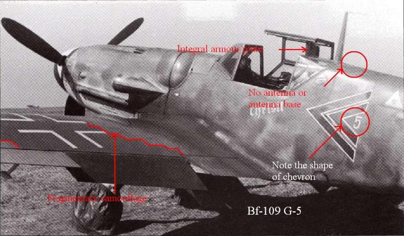Note that this aircraft is lacking the canopy air intake/silica pellets that would also help to identity this as a G-5 variant. The figure '5' appears in-between (and not inside or on) the chevron. We do know that all Erla built G-6s are virtually identical to the G-5's coming off the same lines, except for the silica gel pellets, and head armour which apparently differed on the G-5.