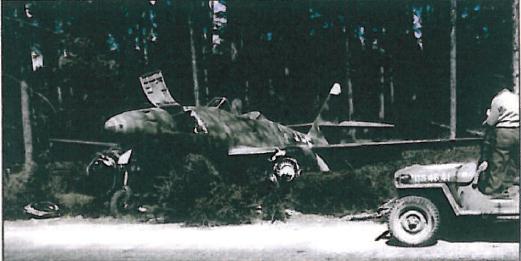 Wars end in Bavaria. Allied troops moving along the Munich-Salzberg Autobahn towards Salzberg pass abandoned Luftwaffe jets including this Me 262 'White F' coded 9K+FH on the strength of KG 51 and probably re-assigned to JV44