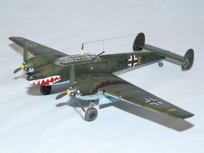 From the amount of google searches arriving here for this kit I thought I'd post a few quick comments. Mine arrived this morning and after a quick gander at the sprues I can report - it's a far cry from Airfix's previous Me 110 ! A lot of kit in a crowded red box and great VFM at £7.99. There is reasonable interior detail including cannon ammo drums, a separate under fuselage bomb rack, two types of bomb, two types of drop tank. Radiator inserts fit to the wings then the separate radiator covers go over these as in the recent 48th scale Emil. The nose MGs and exhausts have been designed to assemble in alignment. The undercarriage is also impressive with wheel well detail and lots of separate parts and can be inserted at the correct forward-slanting angle to achieve an accurate 'stance' not possible on any other 72nd scale Bf110 kit.