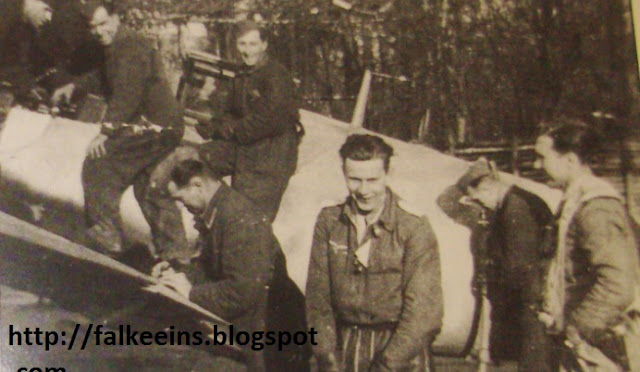 Very rare image from the collection of Robert Eggert (via Ledet) of a youthful (nineteen years old) Lt. Lothar Kabbe seen on his return from a successful combat sortie during 1944. Note the armourers seen counting the remaining rounds. Eggert himself is on the far left of the image supervising.