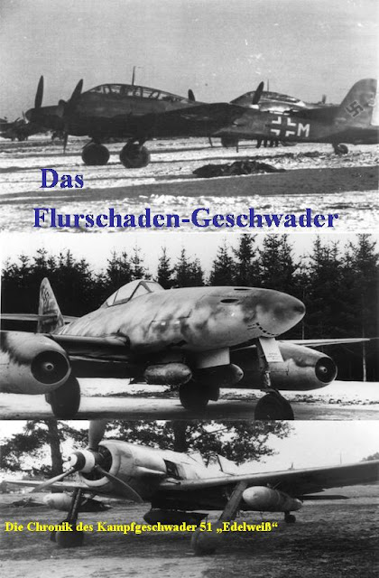Jan Horn's new self-published history of KG 51 from 01 January 1944 to war's end arrived with a thud on the door mat and, given the amount of interest this book appears to have generated on the various forums, warrants a blog post. For what they are worth, my initial impressions then. Horn's work is a large and imposing volume (370+ pages, A-4) written up in a war-diary format with chapters assigned to individual Gruppen. The first part of the work is entitled "The unequal fight in the West" and describes Me 410 long-range night intruder missions carried out by I. and II./KG 51 between February 1944 and August 1944 before the author covers III./KG 51 flying Fw.190 Jabos during the same period. III./KG 51 is rather disconcertingly illustrated with the well-known Bundesarchiv photo sequence of I./SKG 10 Fw 190 Jabos in Normandy. (see Chris Goss 'Luftwaffe Hit-and-run raiders' ) Horn's explanation being that this unit -despite no changes in structure or personnel - had been re-designated from early July 1944.
