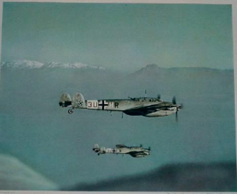 Above; Bf 110's coded '3U' with underwing 900 ltr drop tanks from 9./ZG 26 (probably 'E's) based on Sicily photographed on a convoy escort sortie in the autumn of 1941 over the Mediterranean. The Staffelwappen can be seen on the nose of the aircraft – a stylised " Hahn" or cock on the double chevron of the Zerstörerverbände. A selection of images from a 1943 Luftwaffe calender via Ed Russell at britmodeller.com