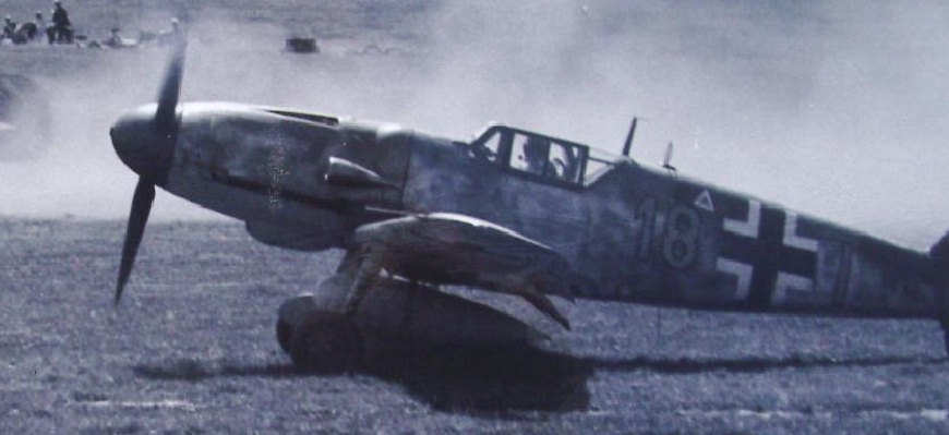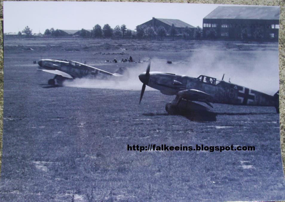 This nice photo was previously published in Jean-Bernard Frappé's " La Luftwaffe face au débarquement " a 350-page French-language account of the Luftwaffe in Normandy and southern France during the summer of 1944, subtitled 'Messerschmitt 109 G and Focke Wulf 190 A au combat en Normandie et en Provence'. Unfortunately in the book this particular image is printed right across a page bind so much of it is lost. It shows Bf 109 G-6s of III./JG 26 taxiing and taking off from Villacoublay-Nord probably during June 1944. According to Frappé the aircraft are 'Blue 10' and 'Blue 18' from 12. Staffel. Note the III. Gruppe vertical bar aft of the Balkenkreuz. Jean-Yves Lorant owns the original negative although the photo is credited in Frappé to Genth via Caldwell.