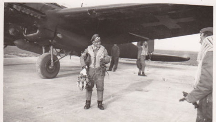 Hakenkreuz (swastika) appears to have to been 'blacked-out'. These images depict an unnamed crew being feted with flowers following their return from a milestone flight. Note the Kapok life jacket. Click on the picture to see the full image and the painted-out cross on the lower wing..
