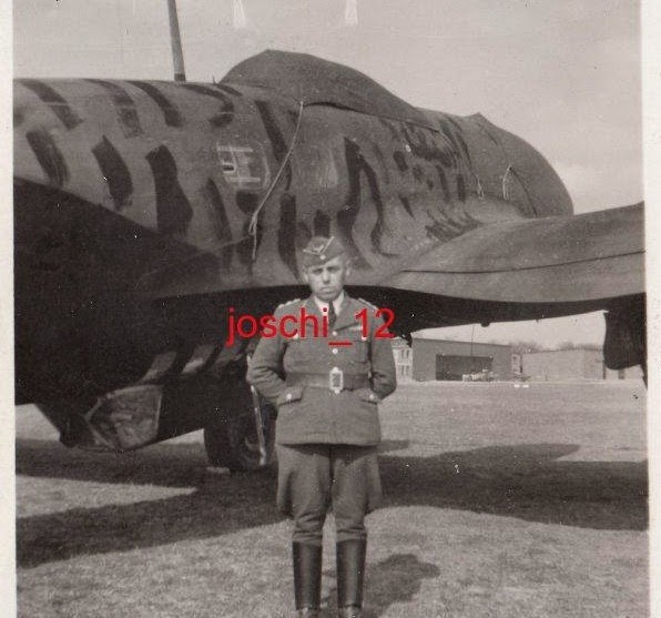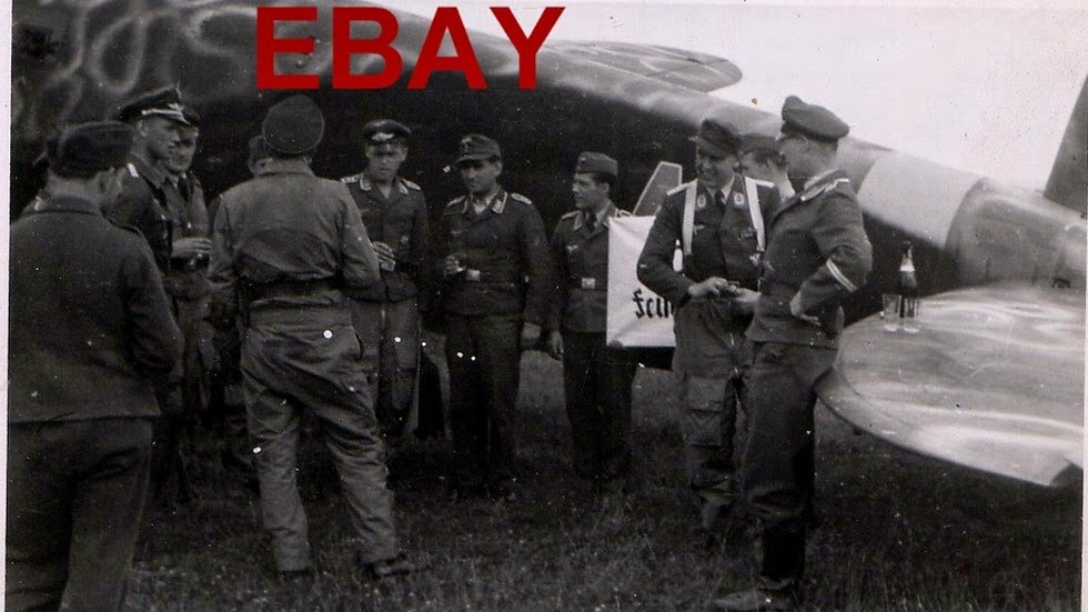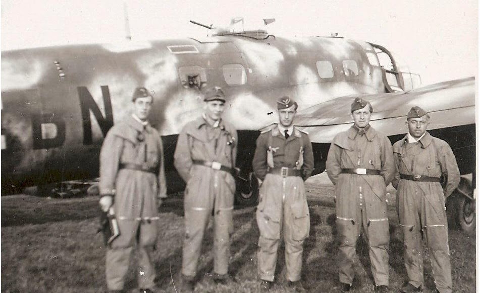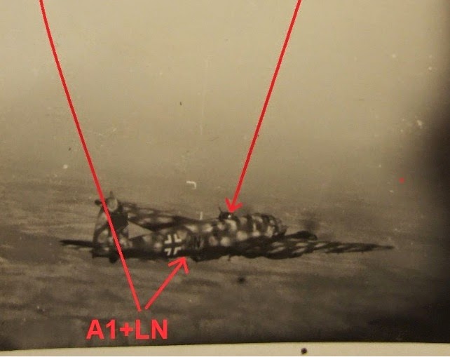 Below; KG 53 machine - captioned in the album as "My crew - from left to right..". The second image caption reads " Taken just before a mission - 'A1+BN' abgesturzt (crashed). Nice view of the dorsal Drehlafette rotatable turret, so probably an H-16/ R1, the designation for the DL 131 electrically powered turret with a single MG 131 in the B-Stand (dorsal) position, standard on the last major production variant, the H- 20.