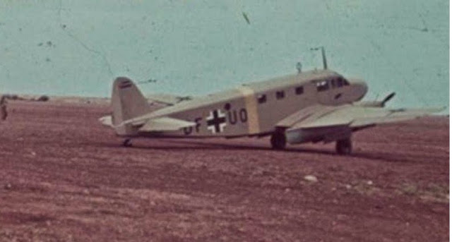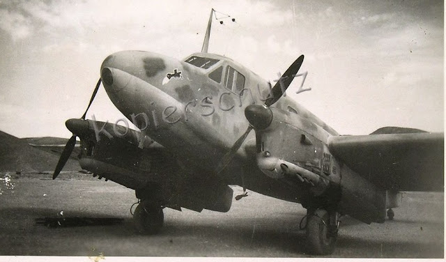 Below; the machine in the next two images may be CD+YK or CD+YL either of the Stabsstaffel Fliegerführer Afrika or Kurierstaffel Tropen. The animal depicted in the emblem is a kangaroo with boxing gloves. Possible loss data - C 445 A-1 - WNr.0518 - CD+KQ (listed as WNr.518) St.St.Fliegerführer Afrika - 100% loss, Derna, Libya on 17-Dec-41. Destroyed by own retreating forces