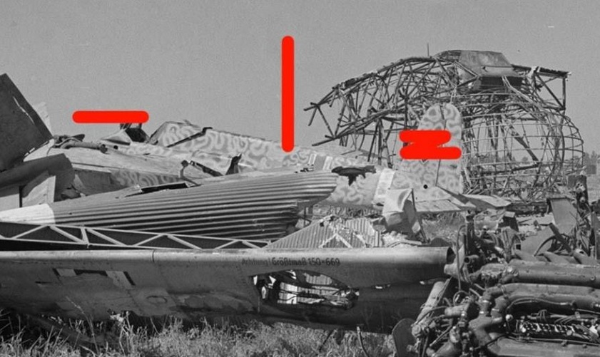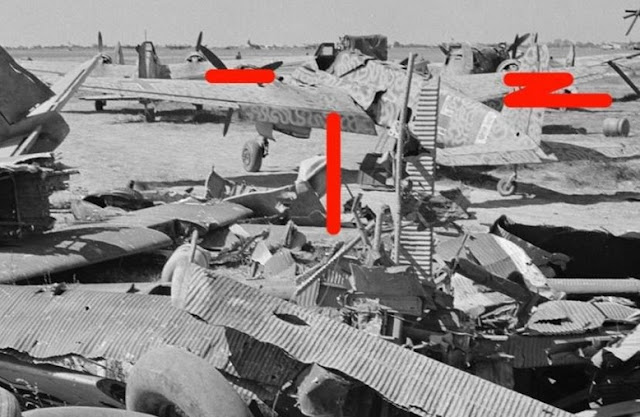 Below; Henschel Hs 129 B of 5.(Pz)/Schlachtgeschwader 1 and burnt-out wreck of Messerschmitt Me 323 Gigant, Tunis, Tunisia, May 1943. Postcard size repro of photo from NARA collection.