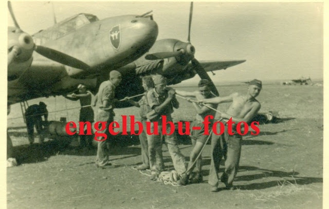 Below; bombing-up a ZG 26 Bf 110 E somewhere in North Africa