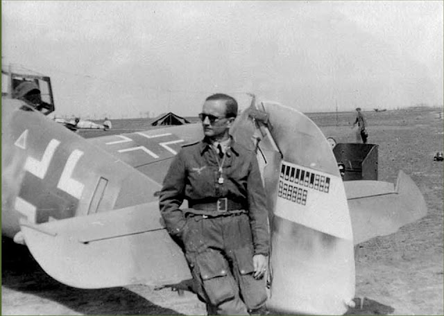 Werfft pictured on 12 April 1944 alongside his rudder scoreboard displaying 16 Abschüsse. Note the elaborate victory markings - the Balken are decorated with RAF roundels for British and white star markings for American victims- single-engine opponents are indicated by a white dot, twins with two dots and Viermots with three white stars..image via Dr. Jochen Prien and credited to 'Archive of Modern Conflict' (JfV 13/I), profile via Revi magazine (Bobek)