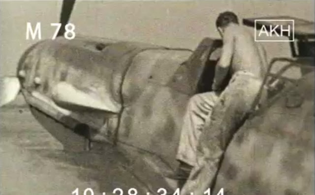 Filmed on 16 September 1943 Graf entertains HJ schoolkids at Wiesbaden and treats them to a fly-past in his Bf 109 G-6 W.Nr. 15 919 (?) "Grüne 1" featuring red spinner and 'tulip' cowl markings and two Werfer rocket grenade launchers. Note what some have referred to as the outer Bf 109 K-style gear doors - which here may hve been trialed as simple blast protectors for the exposed tyre from the Werfer launch. These film clips expertly processed by Karl Höffkes also depict other members of Graf's new Reich's defence unit - particularly RK-Träger Ernst Süß and Alfred Grislawski.