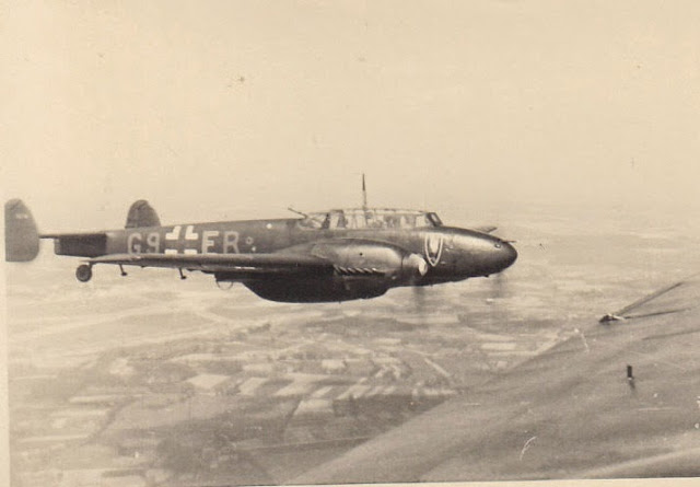 Below; Two views of Me 110 C/D "G9+DR" of 7./NJG 1 displaying the Nachtjagdwappen seen during 1940/41. According to the inscription on the image bottom somewhere off the "coast of Norway"..