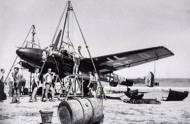 Bf 110 C-4 (L1+DH) from Nachtjagdgeschwader 3 under maintenance at Derna during the summer of 1941. Note the port gear door, the underside of the tailplanes and most of the fin still in RLM 65, possibly spare parts from another machine..