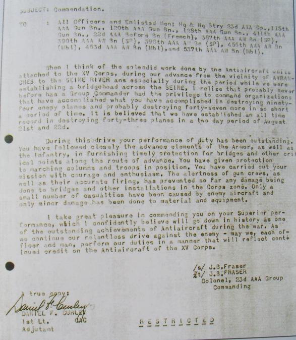 For the single day of 22 August the 463rd Anti-Aircraft dug in along the banks of the Seine claimed 11 Bf 109s and 3 Fw 190s over the course of 7 separate air attacks, the 456th AAA no fewer than 10 Bf 109s and 5 Fw 190s, although there is a good chance that the two US anti-aircraft units were firing at the same aircraft – even so 22 August 1944 was certainly one of the most intense of the war for the US AAA batteries along the Seine. Colonel J.B. Fraser of the 23th AAA Group later wrote;
