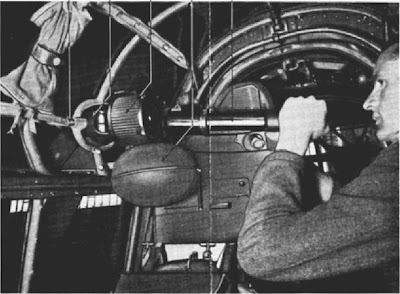 Two views of an early A-variant cockpit showing the instrument panel and forward-firing MG (above) and the pilot's seat and control column (below)