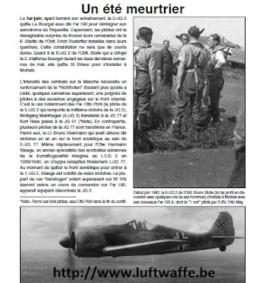 Having completed their conversion training, 2./ JG 2 flew out of Le Bourget on 1 June with ten Fw 190s and headed back to Triqueville. However on their return to Normandy an unpleasant surprise awaited them - their quarters had been taken over by their 6. Staffel comrades under Oblt. Erich Rudorffer. In the event the cohabitation of the two Staffeln on the airfield would be short-lived. Elsewhere Bruno Stolle's 8.Staffel, who had also spent the last two weeks of May at Le Bourget alongside 2. Staffel, now departed St. Brieuc for Morlaix and the coasts of Brittany. The intensity of the fighting along the Channel and the transfer of a number of JG 2 veterans to Geschwader engaged in fighting on the Eastern Front saw the Richthofen receive a number of reinforcements during the month of June. One of the most notable departures to the East was Fw. Otto Pohl, the 5./JG 2 pilot who had registered the Geschwader's 1,000th combat success on 17 April 1942 (his victim on that day an early production RAF Lancaster sent out as part of the low-level raiding force on the MAN diesel engine works at Augsburg, deep in Bavaria). Another transfer was Wolfgang Wehrhagen of 4./JG 2. Both pilots went to JG 77 while a third, Kurt Rose, was posted to JG 51 - of these three pilots only Otto Pohl survived the war. Several JG 77 pilots were posted back to the Kanal Front with JG 2 - among them Lt. Bruno Siekmann who had achieved ten victories in a year of fighting in the East with II./ JG 77 and Lt. Hermann Staege, an aerobatics champion of the pre-war Kunstflugstaffel, incorporated into I./LG 2 during 1939-40, a Gruppe that had been re-designated I./ JG 77. He had been credited with sixteen victories at the time of his transfer to the West. As most of these Eastern Front veterans were Bf 109 pilots they too underwent the Fw 190 conversion course before joining JG 2.