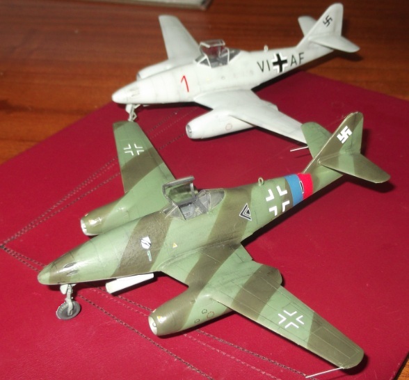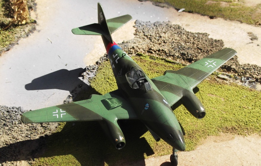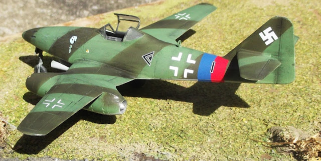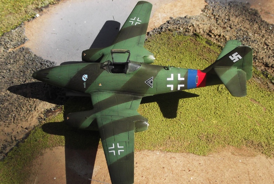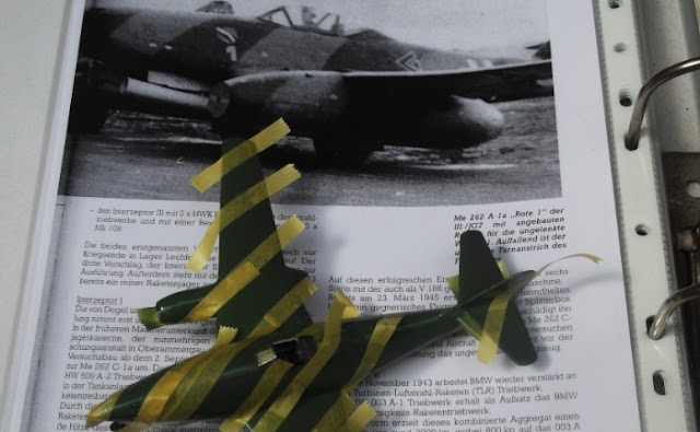 My second 72nd scale Revell Me 262 in a week! Using Xtracolor and WEM Luftwaffe enamels in 82 and 83 this one is finished as one of the 'striped' machines flown by Maj. Rudolf Sinner of the Stab III./JG 7 'Green 1' (note the German-language caption in the Radinger/Schick book extract below states 'Red 1' ) toting twin 21 cm W.Gr. rocket launchers which were tested at Brandenburg-Briest but were no doubt a complete waste of time on such a fast machine as this.