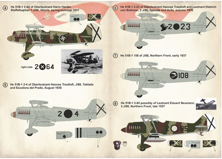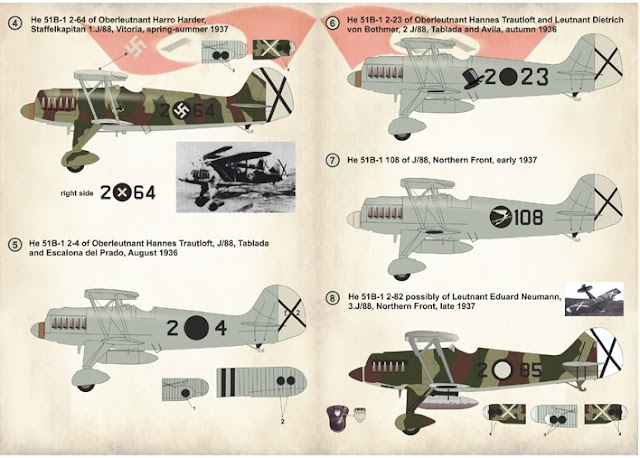 Author Jessen covers the type's early development and also looks at the type's competitors for the RLM's light dive-bomber specification issued in the early 1930s; for example the Fieseler Fi 98 with its wires and struts and the cumbersome gull-winged Ha 137 with its poor flight characteristics - the Hs 123 had single streamlined struts and gear spats and light alloy skinning. I was fascinated to read that while some prototypes had three bladed propellers, production examples didn't because of the cost of the extra blade! Production orders started to arrive during late 1935, the type being manufactured at Henschel's hard-pressed Schönefeld works in Berlin which was also churning out Junkers bombers. Events though soon pushed the Hs 123 into combat. When civil war broke out in Spain the type was quickly shipped to the Nationalists where the 'Angelito' proved durable and the type's performance in the Condor Legion with the creation of the Hs 123-equipped Stuka Kette 88, led by Lt. Brücker won plaudits, stimulating interest from air forces around the world. In fact the Hs 123 was probably the first dive-bomber to see combat anywhere. Sales representative and company pilot for Henschel during the mid-thirties was WWI Jasta 20 Albatros 'ace' Alexander von Winterfeldt - who accompanied a shipment of Hs 123s to China during 1938. The twelve Chinese Hs 123s carried out bombing attacks on Japanese warships on the Yangtze river while von Winterfeldt would go on to command units of JG 2 and JG 77 during WWII.Indeed the type's early operational service probably carried far greater impact than even it's supporters could have imagined - from its involvement in the Sudeten crisis, its much more active role with the Condor Legion over Spain in 1936 and 1937 to its critical role in the Polish campaign where the machines of II./ (S) LG 2 undertook key ground-attack duties in von Richthofen's Luftflotte 4 contributing hugely to the defeat of Polish General Kutrzeba's counter-attack threatening the northern flank of German Army Group South. The Poles had never experienced such ferocious and sustained bombing and ground attack. Notably one of the Henschel pilots was a future fighter General -Adolf Galland.