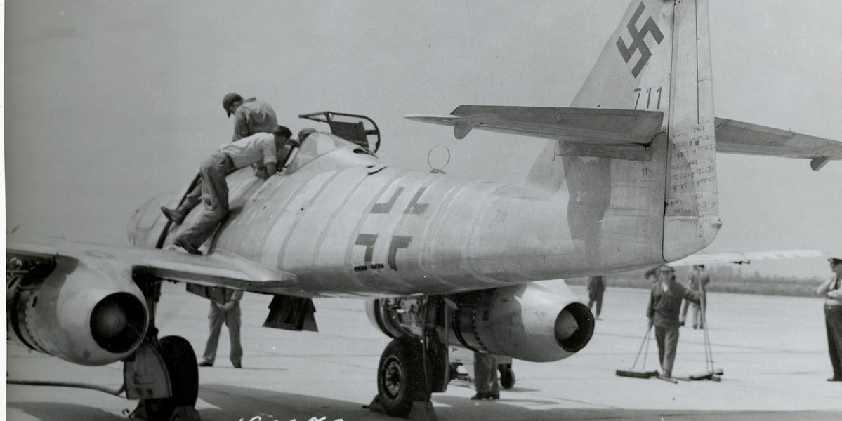 31 March 1945: Messerschmitt AG test pilot and technical inspector Hans Fay (1888–1959) defected to the Allies at Frankfurt/Rhein-Main Airfield at the controls of a brand new Me 262 A-1 twin-engine jet fighter.